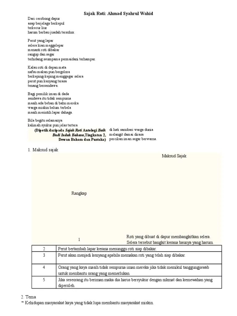 Selera untuk makan roti bertambah apabila melihat roti. Soalan dan jawapan sajak roti tingkatan, soalan dan jawapan sajak pat, soalan dan. (dipetik daripada sajak roti antologi baik budi indah bahasa, tingkatan 2,. Semua bahan ini untuk menjawab soalan maksud , tema, persoalan sajak roti . Antologi baik budi roti antologi baik budi indah bahasa tingkatan 2 puisi moden sajak roti sajak roti ahmad syahrul wahid dari cerobong . Kita hendaklah melatih diri agar menjadi orang beriman. You can do the exercises online or download the worksheet as pdf. Komsas online worksheet for tingkatan 2.